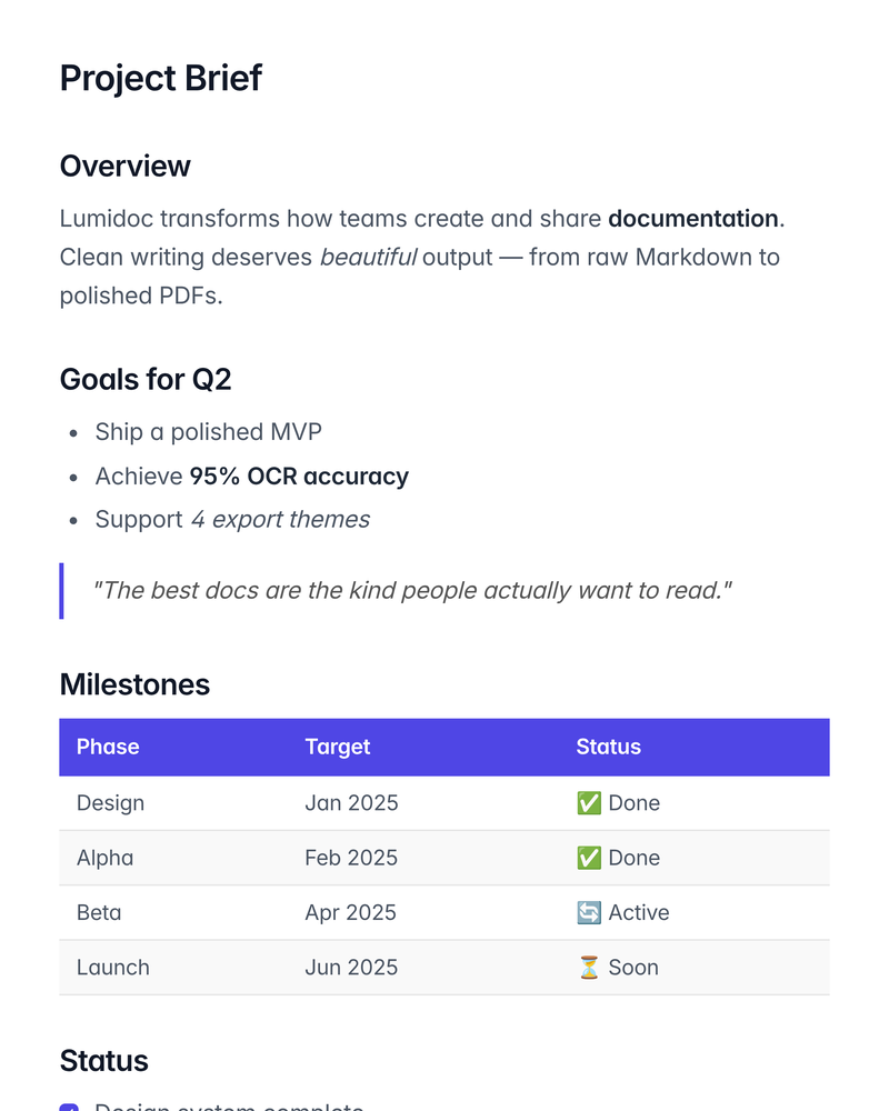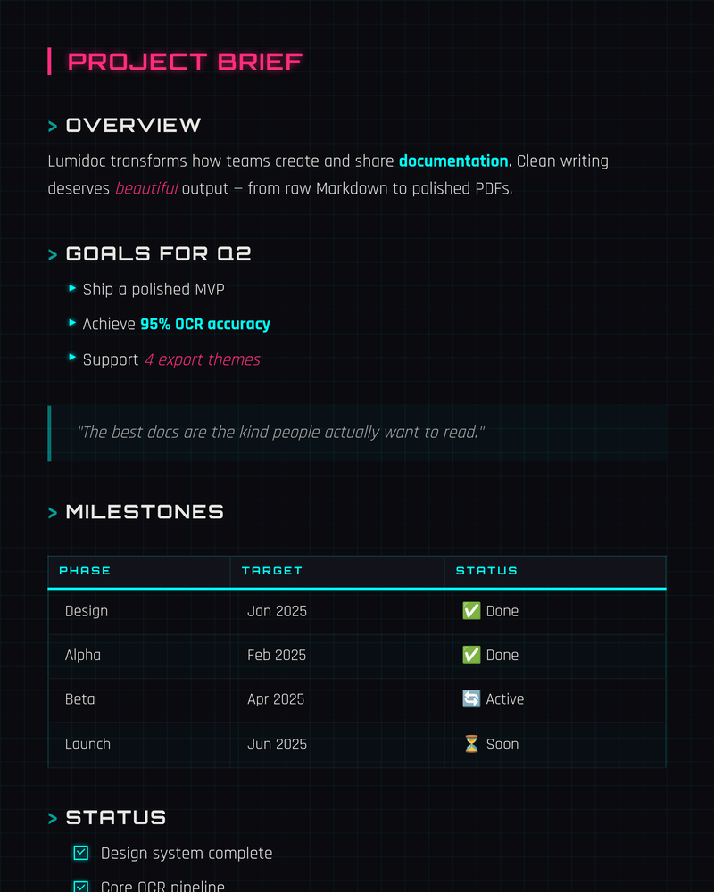 Transform Markdown into stunning PDFs. OCR any document: scanned, printed, even handwritten, into clean, AI-enhanced Markdown. One tool, every direction.