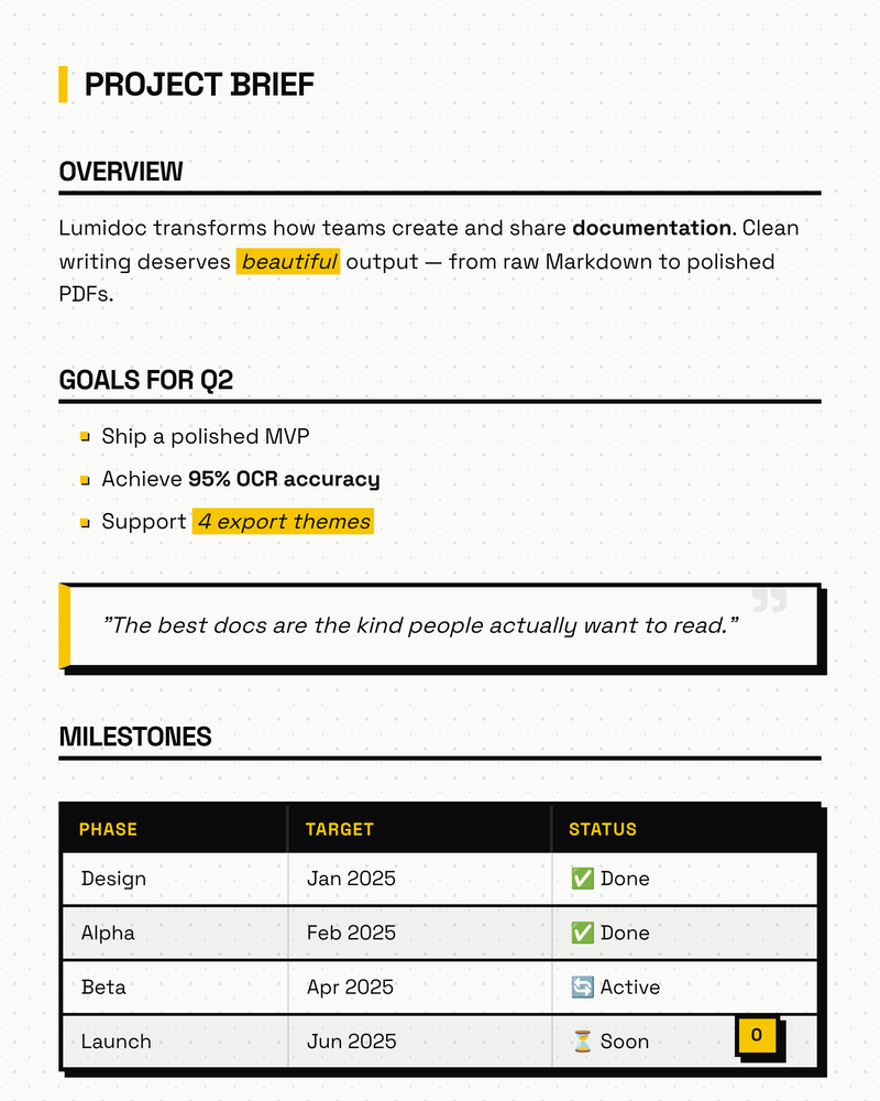 Visit Support & Contact →Turn chaotic PDFs, DOCX files, and presentations into clean, beautiful documents you are proud to share, in seconds.